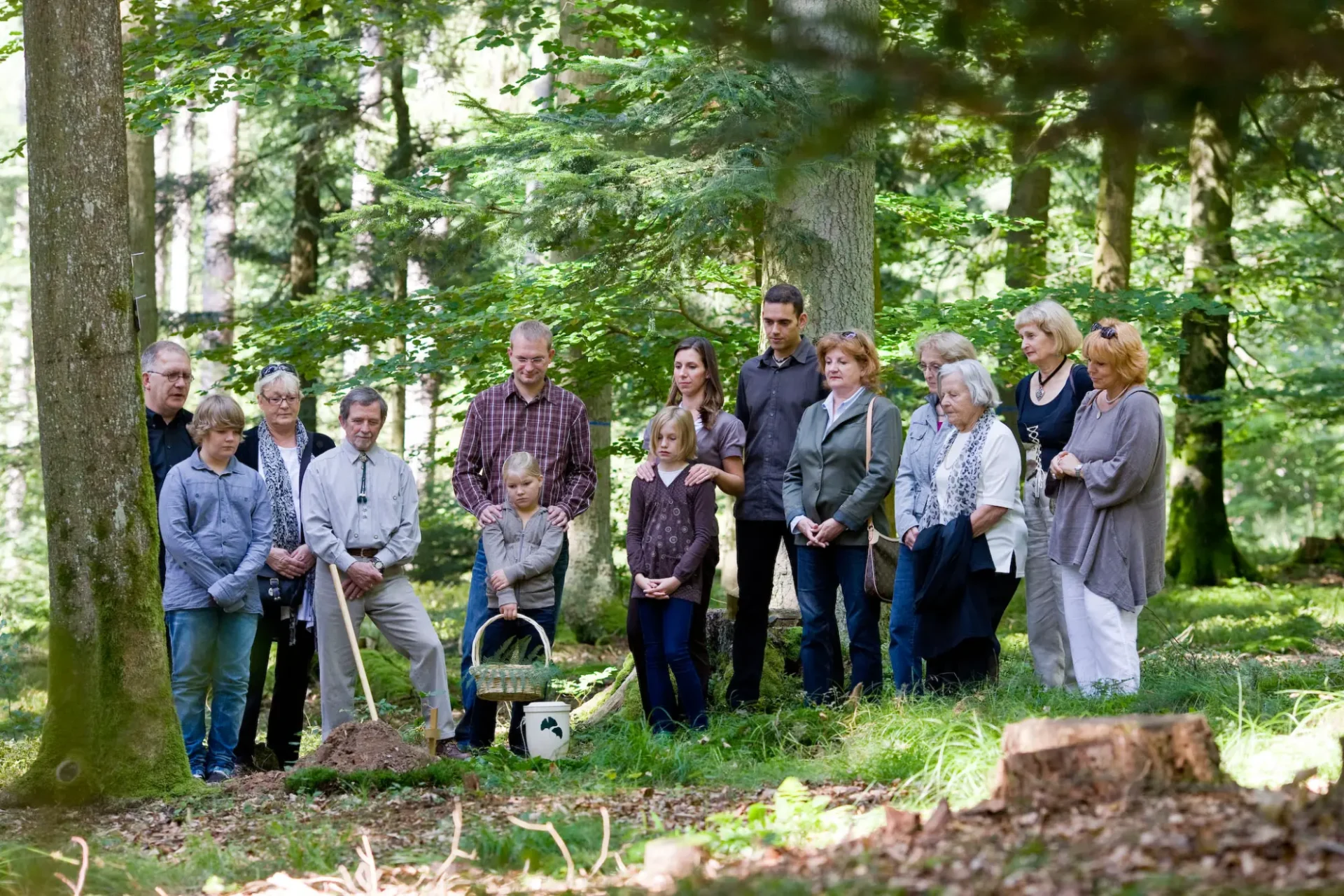 Naturverbundenheit und eine Bestattungsform die die tradierten Rituale intensiv lockert. Diese moderne Bestattungsform hat in den letzten Jahrzehnten an Bedeutung gewonnen und paßt sich den modernen Lebensgewohnheiten an. Der christliche Rahmen wird aufgebrochen. Ein Waldspaziergang ersetzt den Besuch auf dem Friedhof. Eine vorherige Einäscherung ist notwendig.